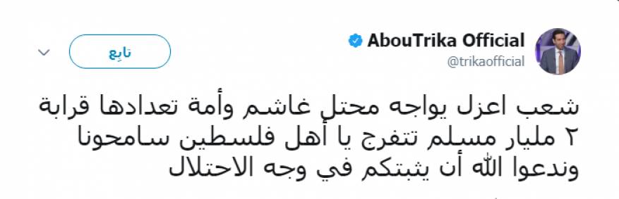نشر اللاعب المصري الشهير محمد ابو تريكة تغريدة على موقعه بتوتير تضامنا مع القدس المحتلة وتحديدا المسجد الاقصى المبارك والاشتباكات الدائرة مع الاحتلال منذ عدة ايام .