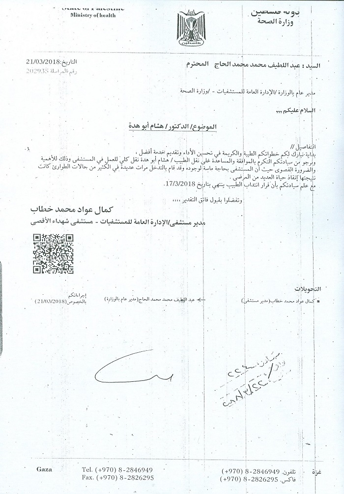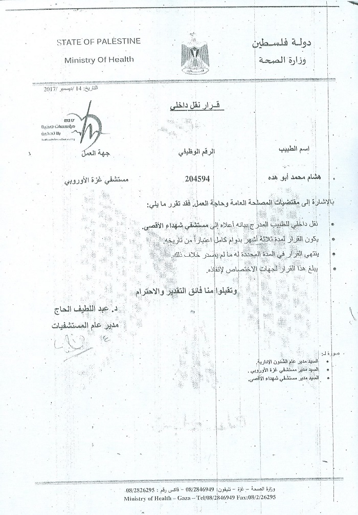 هي رسالة نوجهها لكم بالنيابة عن مئات الاف الفلسطينيين في قطاع غزة وبالذات في المنطقة الوسطى حول قضية البروفيسور "هشام ابو هدة" الخبير الفلسطيني الدولي في جراحة المخ والاعصاب والذي يعتبر الوحيد في تخصصه في منطقة وسط قطاع غزة.