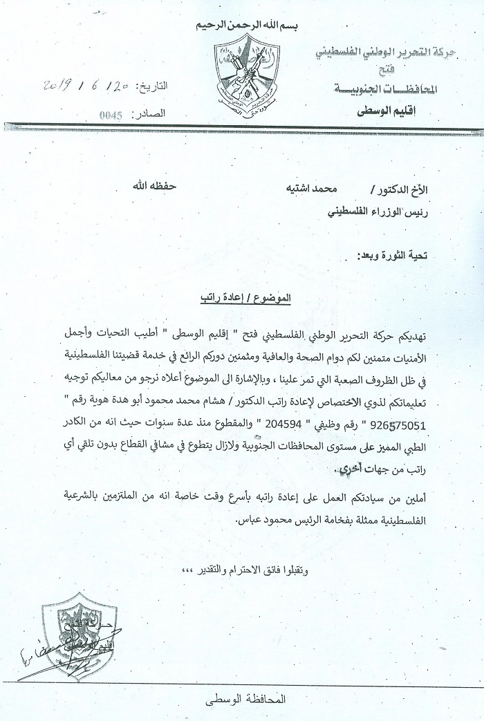 القضية تتعلق بوقف راتب الدكتور المذكور منذ سنوات ورغم كافة المحاولات التي قام بها الكثير من المخلصين وقيادات حركة فتح في قطاع غزة وحتى كتاب موجه من السيد اللواء ماجد فرج مدير المخابرات الفلسطينية ورئيس الوزراء السابق "رامي الحمد الله" ووزراء الصحة السابقين حول ضرورة اعادة راتبه الا ان تلك المحاولات باءت بالفشل.