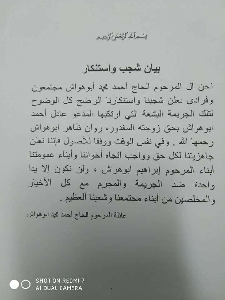وقالت العائلة في بيان لها: “في نفس الوقت ووفقا للأصول فإننا نعلن جاهزيتنا لكل حق وواجب تجاه إخواننا وأبناء عمومتنا أبناء المرحوم إبراهيم أبو هواش، ولن نكون الا يدا واحدة ضد الجريمة والمجرم مع كل الاخيار والمخلصين من أبناء مجتمعنا وشعبنا”.