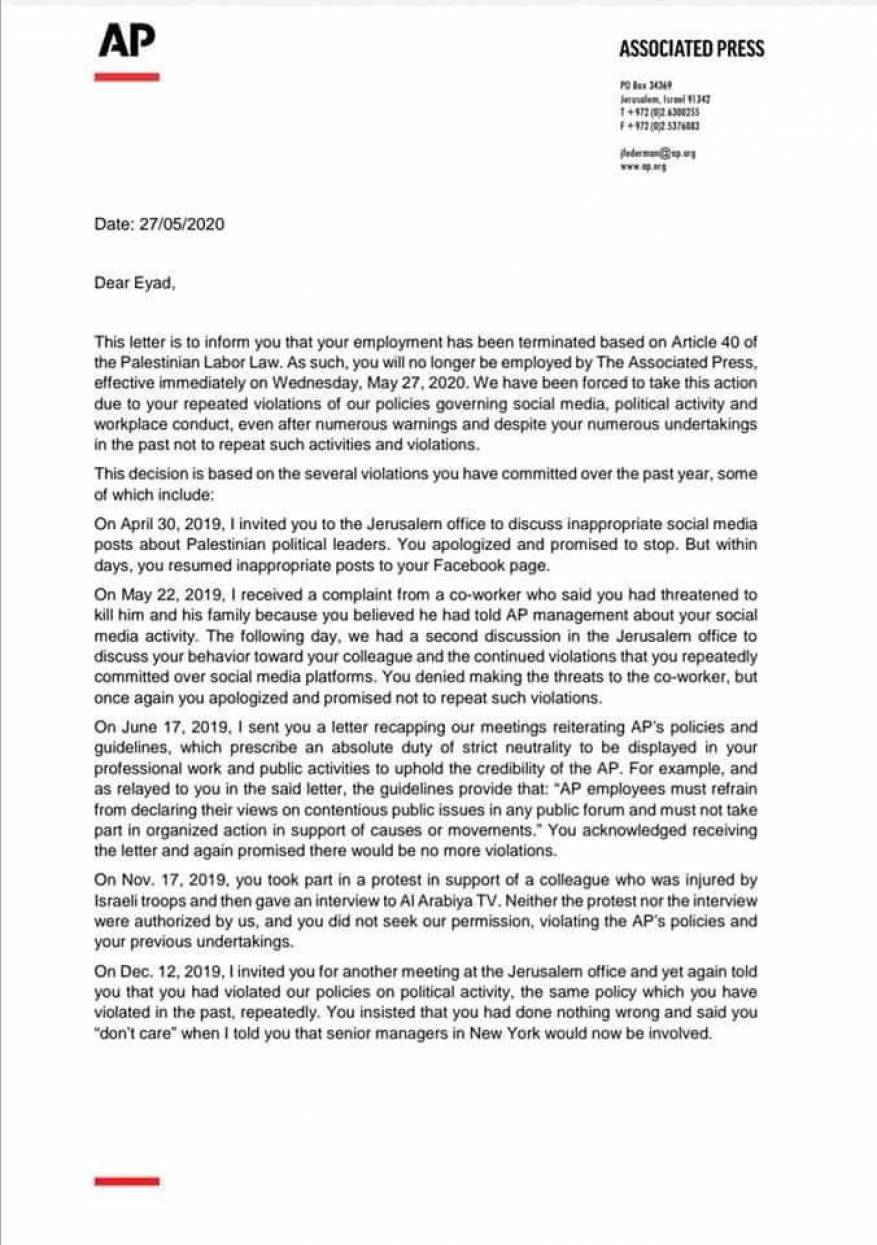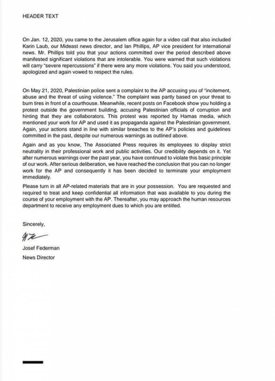 هذه الرسالة لإبلاغك بأنه تم إنهاء عملك بناءً على المادة 40 من قانون العمل الفلسطيني على هذا النحو لن يتم توظيفك من قبل وكالة أسوشيتد برس اعتبارًا من يوم الأربعاء الموافق 27 مايو 2020 لقد اضطررنا إلى اتخاذ هذا الإجراء بسبب انتهاكاتك المتكررة لسياساتنا التي تحكم وسائل التواصل الاجتماعي والنشاط السياسي والسلوك في مكان العمل ، حتى بعد تحذيرات عديدة وعلى الرغم من تعهداتك العديدة في الماضي بعدم تكرار مثل هذه الأنشطة والانتهاكات.