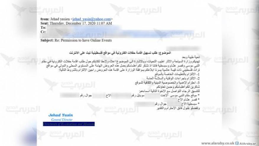 بدورها، ردت وزراة السياحة من البريد الإلكتروني لمدير عام المتاحف والتنقيبات الأثرية، جهاد ياسين مباشرة وجاء فيه: "الأخت...... المحترمة. الموضوع: طلب تسهيل اقامة حفلات إلكترونية في مواقع فلسطينية تبث على الإنترنت. تحية طيبة وبعد، تهديكم وزارة السياحة والآثار أطيب التحيات، وبالإشارة إلى الموضوع أعلاه ولاحقا لكتابكم حول طلب إقامة حفلات إلكترونية في مقام النبي موسى وقصر هشام وسبسطية فإننا إذ نشكر لكم اهتمامكم بعمل هذه العروض الهامة على المستوى المحلي والدولي في مواقع تراث فلسطيني ذات قيمة عالمية يسرنا إبلاغكم بموافقة الوزارة على إقامة هذه العروض".