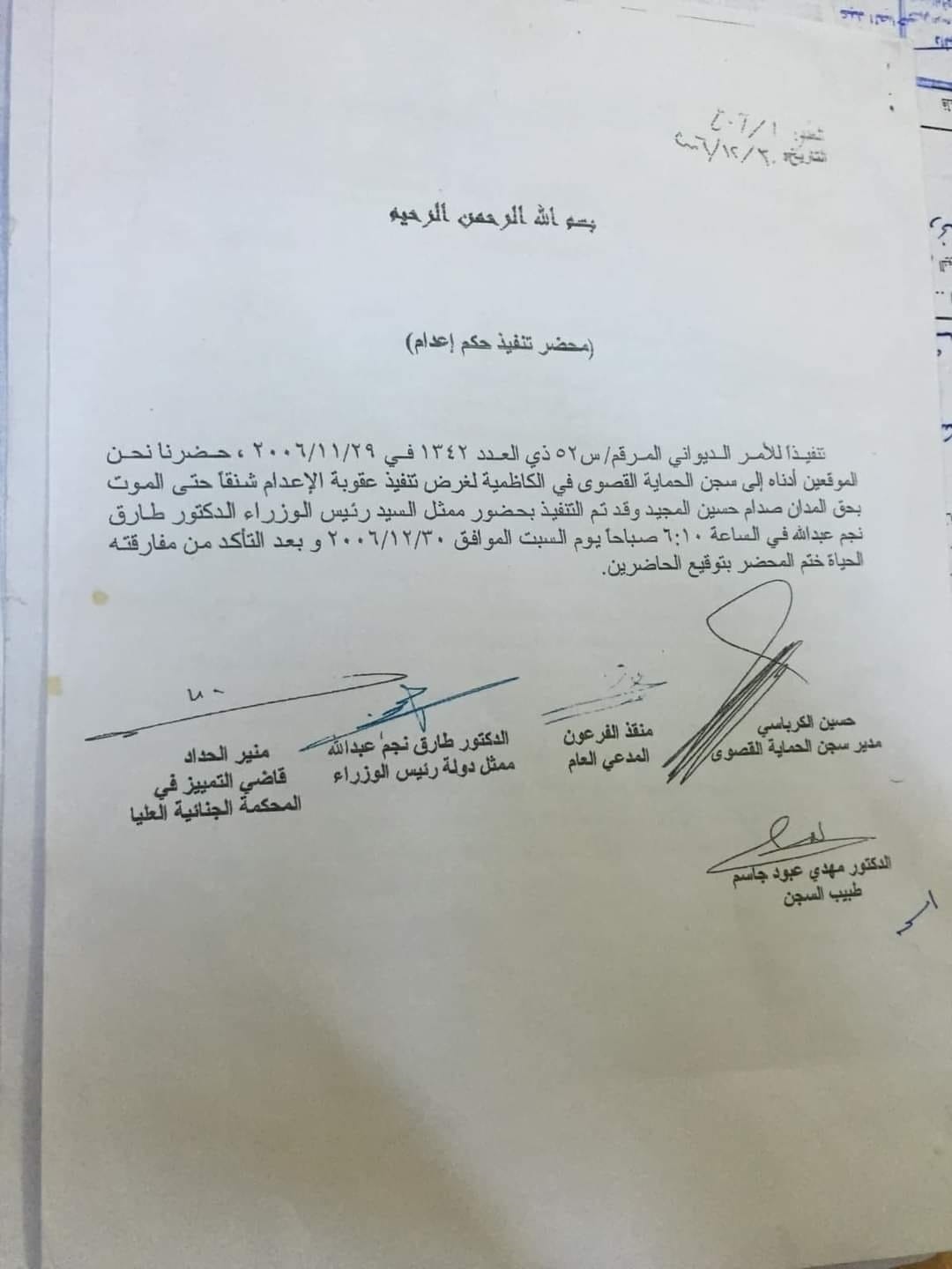 نشر القاضي العراقي منير حداد، صورة نادرة للرئيس العراقي الراحل صدام حسين، لحظة قراءة قرار التمييز بإعدامه.
