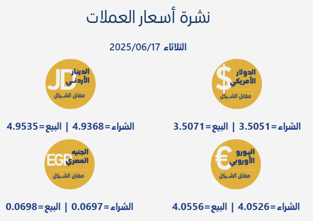 جاءت أسعار صرف العملات مقابل الشيقل الإسرائيلي، اليوم الثلاثاء، بحسب سلطة النقد الفلسطينية، على النحو التالي: